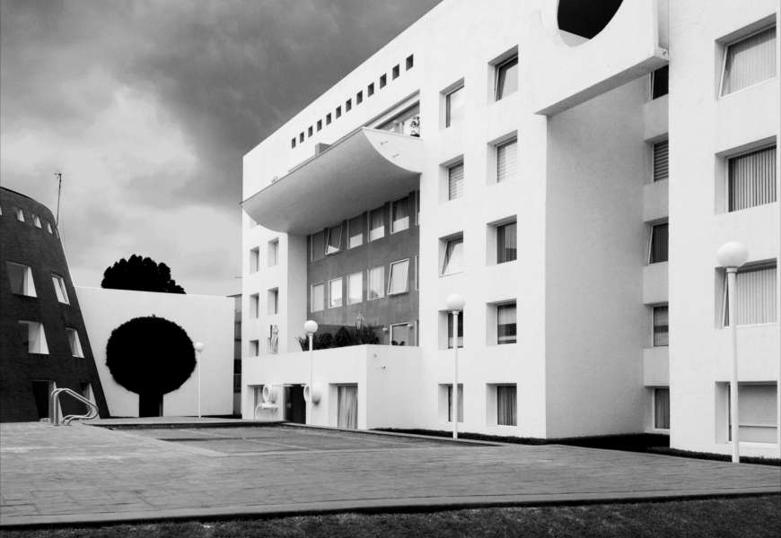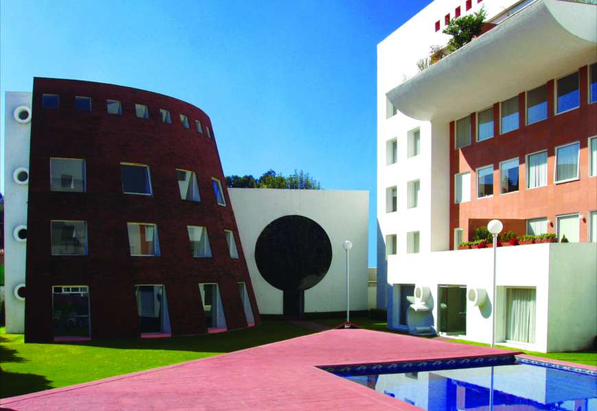 Fuentes de las Fuentes se levanta en muros con detalles simétricos que llevan, por su representación universal, al orden y a la quietud. Se ubica en una de las zonas más privilegiadas de Satélite, Estado de México. Si bien la bóveda celeste no es una construcción artificial, funge como un accesorio natural que permite la entrada de luz o de sombras, mismas que juegan en la alberca que funge como un espejo de agua. El color, característico de esta obra; blanco y café, así como los cilindros de piedra adosados y los distintos planos que tienen las fachadas, logran que los edificios tengan un aspecto único y ulterior para su época.