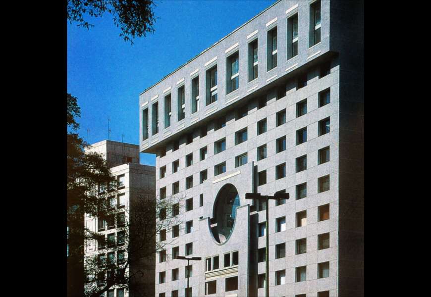 Esta obra bien podría ser parte de cualquier metrópoli del mundo, pero es en Bosques de las Lomas, Ciudad de México, donde esta construcción de colores grisáceos se erige.